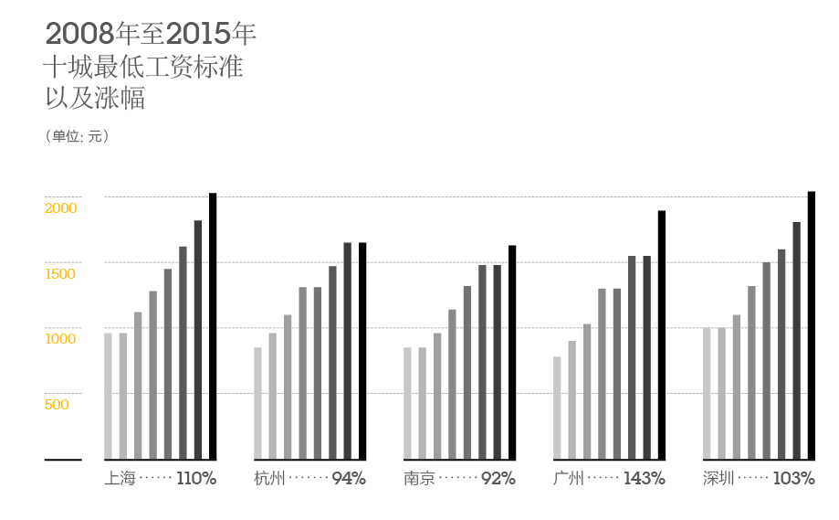 2008年至2015年 十城最低工资标准 以及涨幅