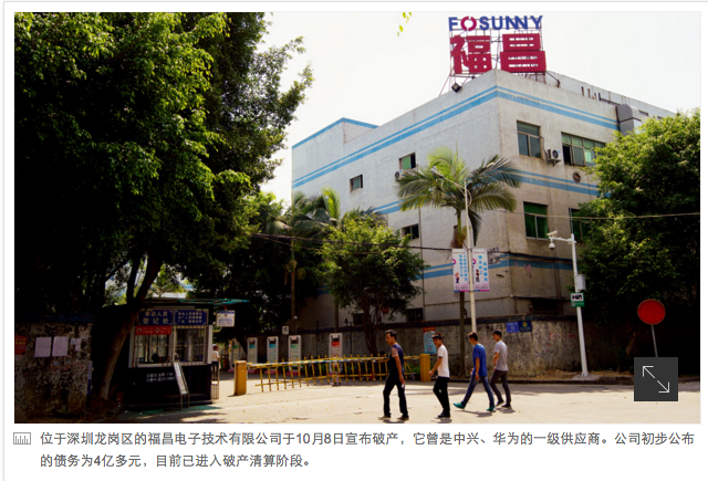 位于深圳龙岗区的福昌电子技术有限公司于10月8日宣布破产,它曾是中兴、华为的一级供应商。公司初步公布的债务为4亿多元,目前已进入破产清算阶段。