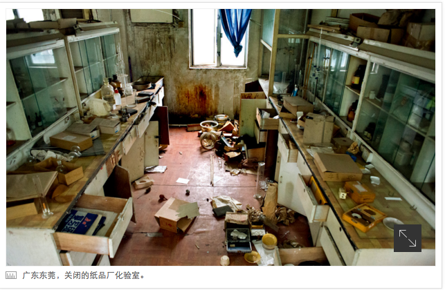 广东东莞,关闭的纸品厂化验室。
