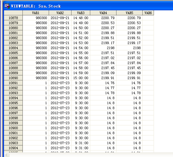 (1) 采用数据类型转换函数将交易时间变量ttime转换为字符格式,去掉中间的分隔符,即hhmmss的形式;再将其重新转换为时间格式;由于SAS能够接受 的外部时间数据格式中,时、分、秒之间必须用“:”、“/”、“_”或者空格隔开,因此重新转换为时间格式需要用字符连接运算和取字串函数产生一个新的时 间字符变量,然后再行转换。
