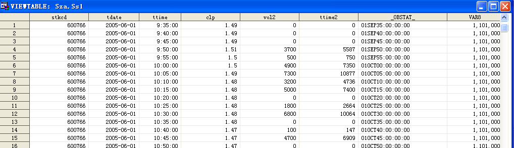 (1) 采用数据类型转换函数将交易时间变量ttime转换为字符格式,去掉中间的分隔符,即hhmmss的形式;再将其重新转换为时间格式;由于SAS能够接受 的外部时间数据格式中,时、分、秒之间必须用“:”、“/”、“_”或者空格隔开,因此重新转换为时间格式需要用字符连接运算和取字串函数产生一个新的时 间字符变量,然后再行转换。