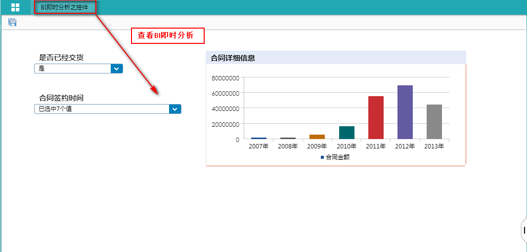 2. BI即时分析的查看上一节商业智能系统配置中增加了一个BI即时分析的目录,该目录下面的模板类型均为BI即时分析,如下图,我们点击BI即时分析之控件模板,可以看到该即时分析的效果: