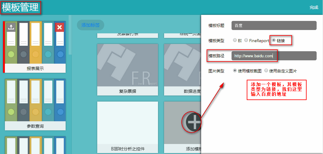 4. 链接查看在系统配置>报表管理中,为报表展示模板添加一个子模板,模板类型为链接,URL地址为百度的地址,添加完成之后,点开该模板,查看效果,如下图: