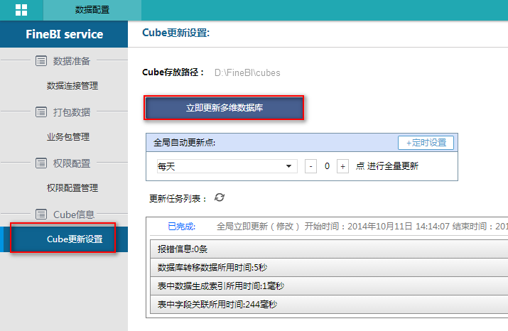 4. Cube更新业务包创建完,权限分配之后,选择Cube更新设置,点击立即更新多维数据库按钮将数据库中的数据更新到Cube中,如下图: