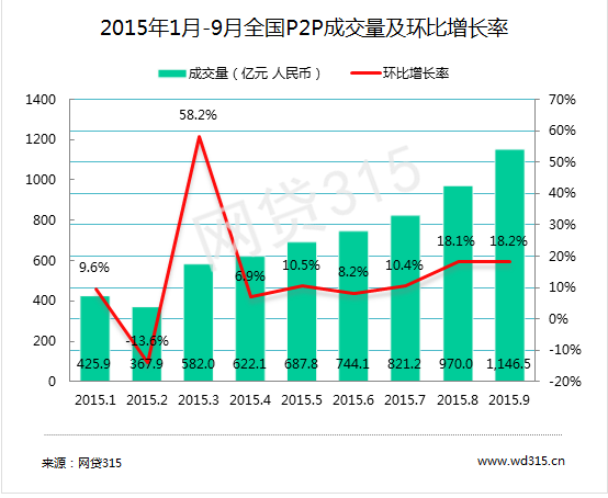 图表1 2015年1月-9月全国P2P成交量及环比增长率