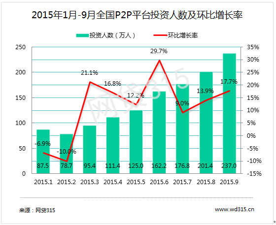 图表2 2015年1月-9月全国P2P平台投资人数及环比增长率