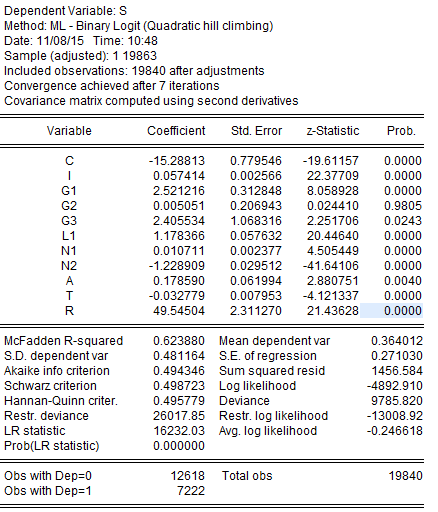 下图是我对近2W张订单数据做的一个logit回归,但是对于检验一直没用找到用EVIEWS的检验分析,按网上的说法,概率为0,完全不拟合?个人认为这种判断是不可能的,从检验结果来看,基本都通过显著性检验的,那就是不同统计软件自身的原因?