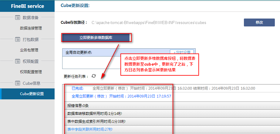 点击保存对业务包的操作,业务包新建好了,接下来需要将数据表中的数据加载到cube中,点击cube更新设置,点击立即更新多维数据库,即可将数据更新到cube中了,如下图: