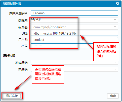 点击新建数据连接,添加一个数据连接,如下图,数据连接命名为BIdemo: