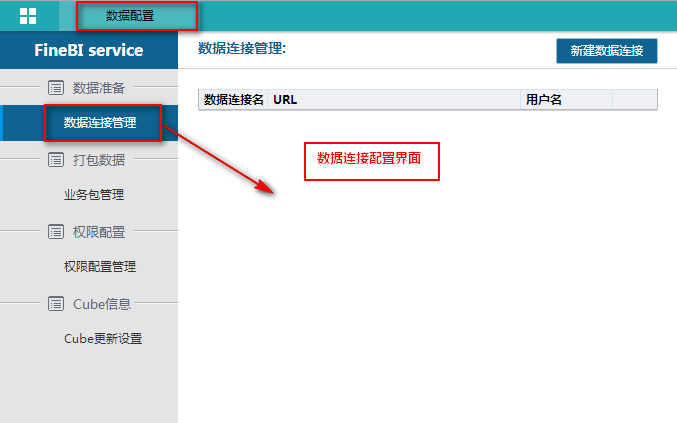 1. 新建数据连接拥有BI数据配置权限的用户登录系统http://localhost:8080/FineBI/ReportServer?op=fbi,一般是管理员,点击数据配置进入FineBI service界面,在左侧列表中选择数据连接管理选项,进入数据连接配置界面,如下图: