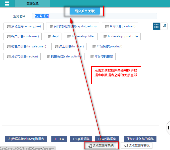 在数据库中数据表之间是通过主键外键进行关联的,那么FineBI商业智能也能将这些关联关系读取进来,作为数据分析的基础,如下图,点击读取数据库关联,将数据库中的主外键关联读取进来: