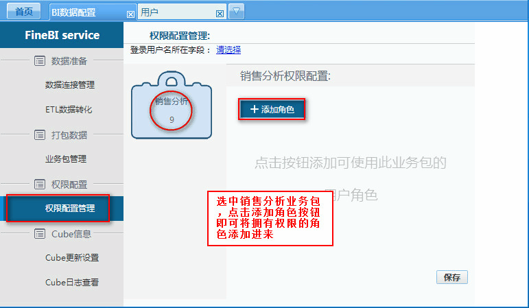 用户配置完成之后,点击BI数据配置>权限配置管理,选中销售分析业务包,由于该分析是由管理组的助理(Anna)新建给管理组的负责人(Cherry)查看,所以需要给这两个角色配置业务包使用权限,点击添加角色,添加管理组的助理和管理组的负责人两个角色,如下图:
