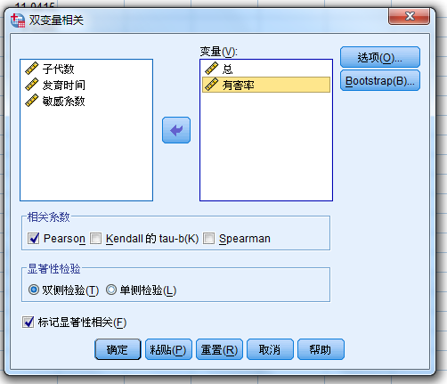 xddlovejiao1314 发表于 2015-11-11 21:43 你想做“总”和“有害率”间的相关哇,按理说改不改名对结果影响不大的。我个人觉得可能是你SPSS版本没破 ...