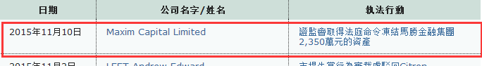 原讼法庭因应香港证券及期货事务监察委员会(证监会)根据《证券及期货条例》第213条提起的法律程序,针对无牌投资公司马胜金融集团(马胜集团)颁布多项临时命令,当中包括将该公司在香港持有合共约2,350万元的资金全部冻结(注1)。法庭亦于2015年11月6日颁布临时命令,禁制马胜集团在未领有牌照的情况下显示其进行受规管活动,以及将该公司以“马胜金融”的品牌名称推广其进行受规管活动所用的网站关闭。