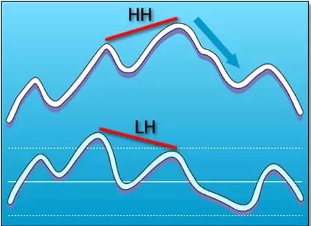 现在,如果汇价形成一个更高的高点(HH),但是震荡指标却形成一个更低的高点(LH),那么,我们就会看到常规空头背离的形成。