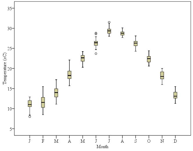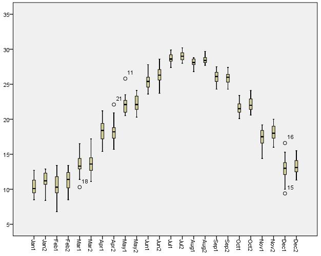 第二阶段12个月的温度。出现1月奇异低值,6月奇异低值和奇异高值,7月奇异高值。