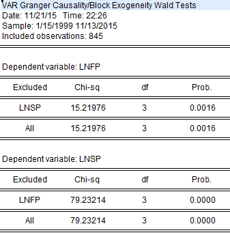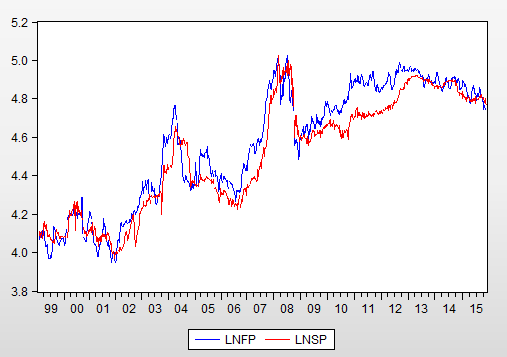 gloryfly 发表于 2015-11-21 23:01 看图形是有协整关系的,因而也是有因果关系的,不过你直接做Granger因果关系检验是有问题的,应该先做协整, ...