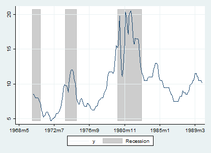 比如我研究资产价格变动,需要在某些时间区间内标出阴影以显示经济衰退期,这个如何在Stata里实现。Chris. Baum写过一个程序--nbercycles--,里面自动包括了NBER定义的美国的经济周期,但是如果采用的是