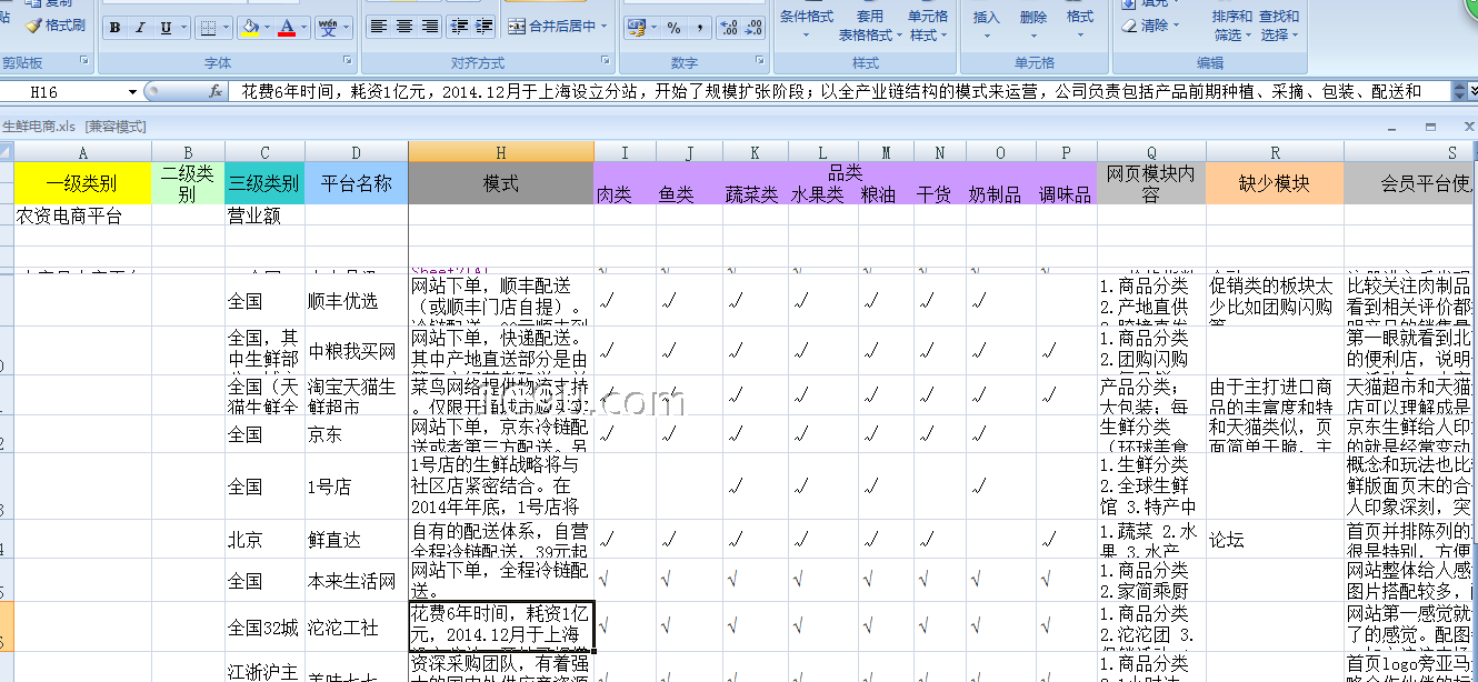 (包括沱沱工社,多利农庄,中粮我买网,顺丰优选,美味七七,易果生鲜,天天果园,鲜码头,甫田网,依谷网,菜管家,优菜网,正谷农业等),重点版块:渠道分析,网页模块内容,会员平台使用感受(花了大量时间),优缺点,公司基础资料等。懂得入。。