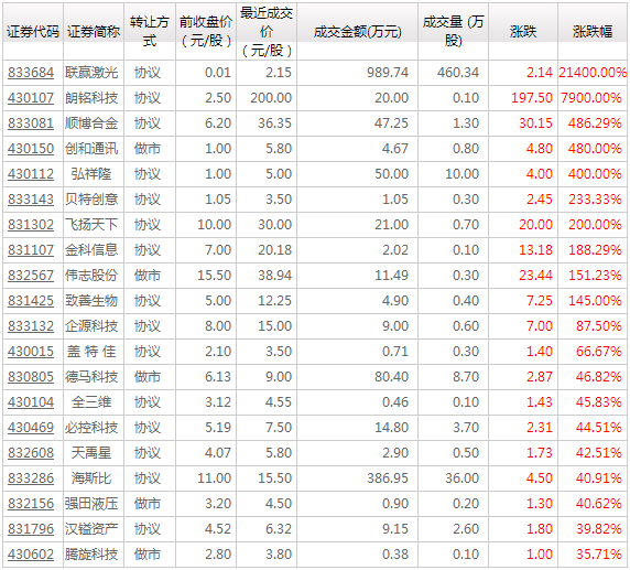 从涨幅榜的排名可以看出,今日盘踞榜首的是联赢激光,股价从0.01元增涨到2.15元,涨幅为21400%,成交额为989.74万元。排在第二位的是朗铭科技,股价从2.5元增长到200元,今日涨幅7900%,成交额为20万元。 第三名是顺博合金,涨幅为486.29%,成交额为47.25万元。今日前三名均为协议转让交易。