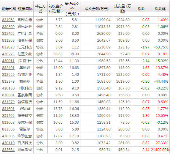 今日盘踞成交额首位的是明利仓储,成交额为11190.04万元,成交量为1730.50万股,全天涨跌幅为1.4%。第二名为联讯证券,今日成交额为11053.43万元,涨跌幅为-1.06%;第三名为广电计量,成交额为2680万元,涨跌幅为0。今日成交金额前三除广电计量外均为做市交易。
