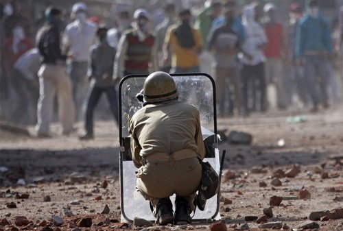 2008年9月9日 一名印度警察使用盾墙防御克什米尔穆斯林抗议者的远程投掷。