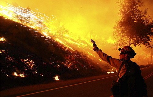 2008年10月12日 洛杉矶北 32 公里 , 消防队员使用照明弹制造回火,以便形成阻隔大火蔓延的隔离区。