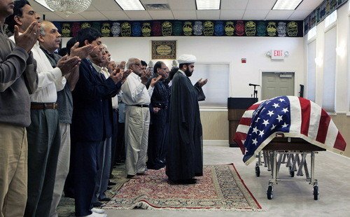 2008年9月22日 教长哈希姆拉扎带领葬礼中的祈祷 , 死者是 Mohsin Naqvi, 巴勒斯坦生的穆斯林 ,8 岁时全家移民美国 , 后来成为军官 , 死于阿富汗路边巡逻。