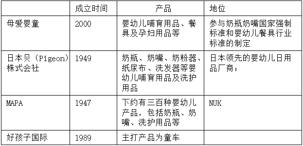 公开资料显示:母爱婴童公司原材料的成本占生产成本的比重达到46.19%,主要由于PP、PPSU、硅胶等原材料依靠外国进口导致生产成本相对较高。原材料严重依赖进口,对齐生产成本构成潜在威胁。表2是母爱婴童业务竞争的相关公司。