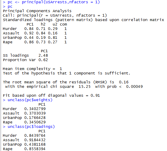 然后使用principal函数pc <- principal(USArrests, nfactors=1),结果如下: