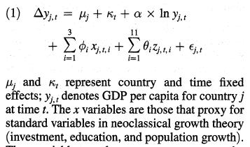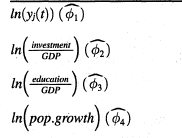 论文直接讲对数线性化和一阶差分索罗增长模型的方程(原句:log-linearize and first-difference the steady-state equation from th e solow growth model)然后得到: