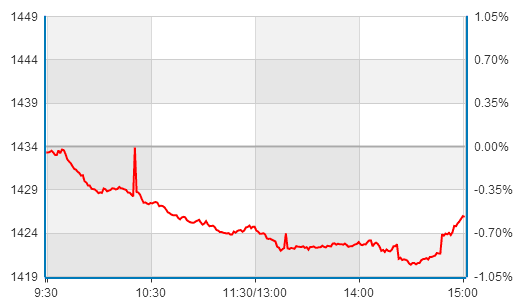 三板做市指数今日以1434.34点开盘,自开盘之后指数急速下降,截至下午收盘:最低达到1420.69点,最终收于1426.23点,涨跌幅为-0.57%。
