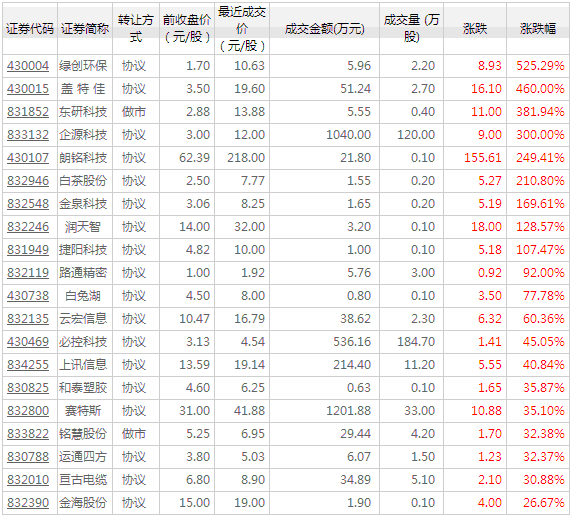 从涨幅榜的排名可以看出,今日盘踞榜首的是绿创环保,股价从1.7元增涨到10.63元,涨幅为525.29%,成交额为5.96万元。排在第二位的是盖特佳,股价从3.5元增长到19.60元,今日涨幅460%,成交额为51.24万元。 第三名是东研科技,涨幅为381.94%,成交额为5.55万元。今日前三名除东研科技外均为协议转让交易。