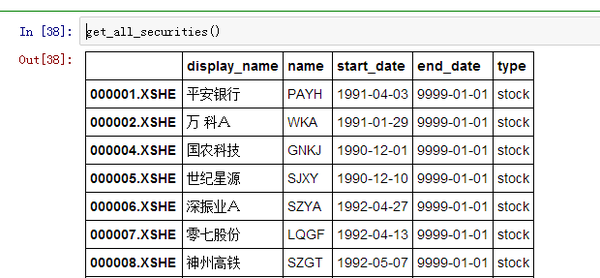 (1)shift+enter运行,我们可以看到我们能获取到数据的股票