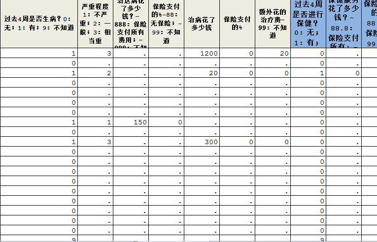我整理的CHNS数据,需要用到医疗保健消费的数据,可是数据大多都是这样的,该怎么办?据说用SPSS可以弥补数据,求大神解答