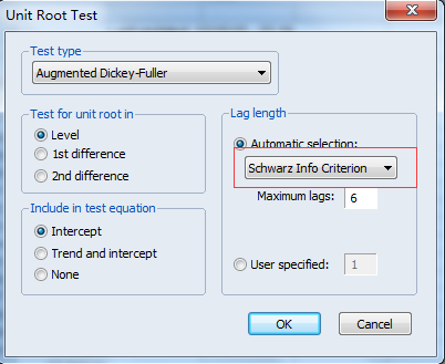 如图说示,在进行ADF检验时,右侧红框中的内容应该选择什么?是Schwarz还是Akaike?这两者作出的检验结果不一样。