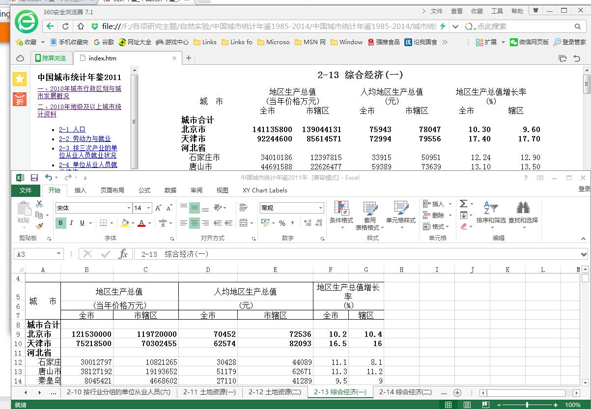 本人下载了论坛部分城市统计年鉴,在对数据进行校对时,发现某些数据不一致。例如,城市统计年鉴2011年(2010年数据),这里的EXCEL版与网页版数据不一致?用哪个呢?如下图!