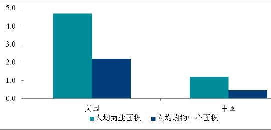 中国与美国人均购物中心面积与商业面积占比(平方米)