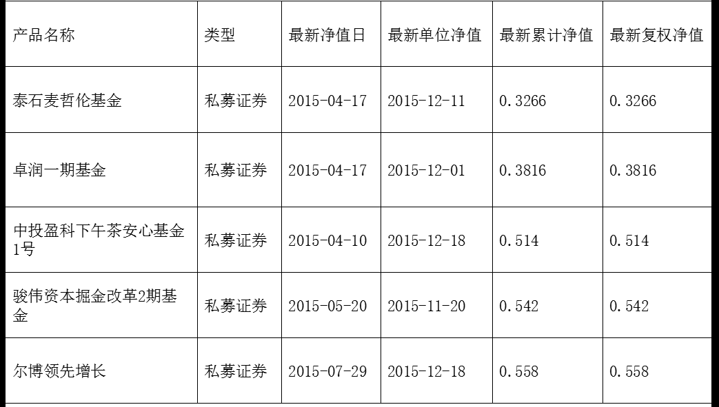 可以看到私募证券类型的产品中泰石麦哲伦基金的最新累计净值为0.3266,卓润一期基金的最新累计净值为0.3816,中投盈科下午茶安心基金1号则为0.514,上述三个产品包揽了私募证券类型产品的倒数1,2,3名。