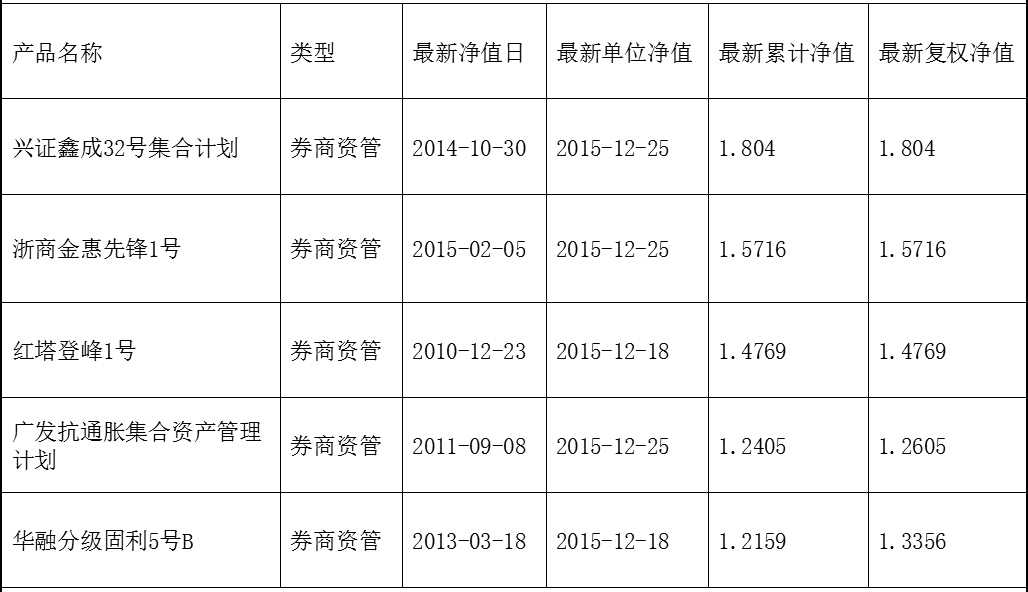 券商资管类型的有566个,其中净值1以下的有182个,净值1以上(包括1)的有384家。券商资管的倒数前5名,分别是如下几家: