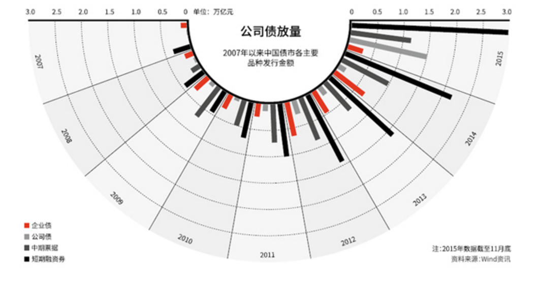 2015年前11个月,上海证券交易所发行的公司债冲上1.5万亿元规模,申报量达到2.6万亿元,其中申报量已经占据信用债市场的半壁江山。如果从2015年4月交易所正式落实公司债新政算起,这一显著的放量只用了七个月时间。