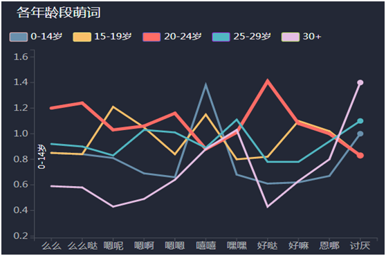 数据还显示,各个年龄阶段的“萌”程度也不尽相同。20-24岁是“最爱卖萌的年纪”(图中红线),几乎所有测“萌词”使用频率都高于平均水平(平均水平为1),其中“好哒”的使用频率是平均水平的1.4倍以上,而其他年龄则都在平均水平以下。
