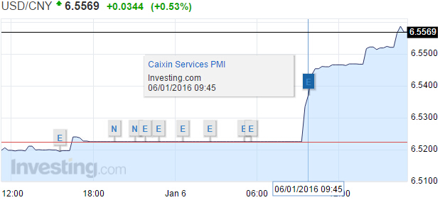 北京时间1月6日,中国央行"离奇"下调中间价,在岸人民币贬值压力迅速升温。午后,跌幅扩大至1.1%,最大逾16:55跌达860点低至6.7319,创2010年9月17日以来最弱。