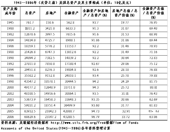 在价值结构上,全球经济表现出金融资产迅速膨胀,美国金融资本主义最大的特征就是金融资本自由化和金融扩张。美国利用发达的金融体系导致大量资本在股市、汇市、债市、期市以及各类金融衍生产品市场循环流动、杠杆放大。据初步统计,当前全球金融衍生产品总的市值超过了680万亿美元,是全球GDP规模的10倍以上,为全球提供了75%的流动性,大大高于各国通过货币创造的流动性(仅占全球GDP的11%)。从美国总资产及其主要构成情况也可见这种变化,美国在1945—1980年的35年中,虚拟资产只增长44.69%,而在1980—2006的24年中,虚拟资产却增长了453.00%,26年的增长量是35年的10倍,其中,金融和地产所占比重占绝大部分,在90%以上(见表1)。这些过剩的流动性不仅催生了金融资产价格泡沫、房地产价格泡沫,更通过全球期货市场向实体经济转移。在发达国家的虚拟资本把期货市场金融化与衍生产品化的时候,还会继续把实物生产领域中所有可以与衍生金融产品沾边的各种合约方式衍生产品化,这也是发达国家之所以可以在物质产业长期萎缩后仍能长期维持贸易逆差的原因,货币创造了自己的需求,即只有需求的增长而没有供给的增长,或需求增长率远高于供给增长率。