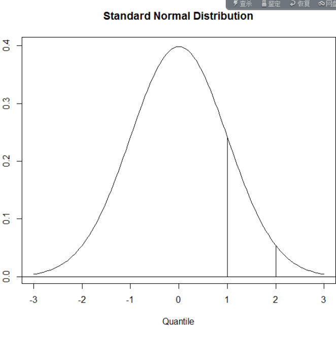 ##绘制密度曲线 x <- seq(from = -3,to = 3,by = 1/20) #标准正态分布密度函数 y <- dnorm(x) # 作一个标准正态图,type="l"是指作线图 plot(x,y,main = "Standard Normal Distribution",type = "l", ylab = "Density",xlab = "Quantile") # 在plot基础上加一条y=0的水平线,h是代表horizon,是水平的意思 # 如果加垂直线,就是v=...,verticle的意思 abline(h = 0) # 这里是确定你要选择的区域,首先选择x在1到2之间的 region.x <- x[1 <= x & x <= 2] # 这是:当x在1到2之间时,y的范围 region.y <- y[1 <= x & x <= 2] #我加了红线,你可以看出来,是哪一块区域 lines(region.x,region.y,col="red",lwd=2) # 对比阶段: polygon(region.x,region.y,density = 10) # 如果没有这两句,就显示的是,上半部分 # 加入后,实际上,在原来的基础上,加了两个点: # (region.x[1],0)和(tail(region.x,1),0)多了这两个点 # 其实这两个点在y=0这条线上 region.x1 <- c(region.x[1],region.x,tail(region.x,1)) region.y1 <- c( 0 , region.y , 0) # 这个,就是从包含了红线,到y=0上的两个点,形成的一个多边形 polygon(region.x1,region.y1,density = 10)