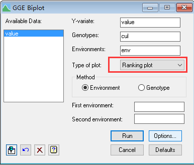 对应GenStat模型如下:将产量(value)导入到Y-variate框中,将品种(cul)导入到Genotype框里面,将环境(env)导入到Environments框里面,在Options里面勾选Connect environment scores with origin。