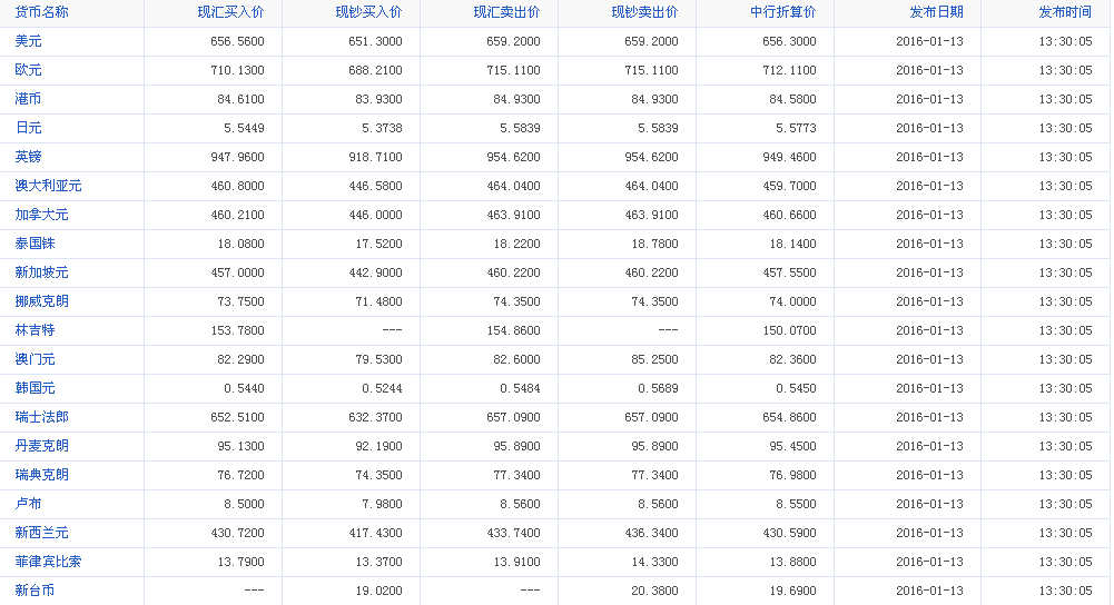 中国银行外汇牌价 2016-01-13