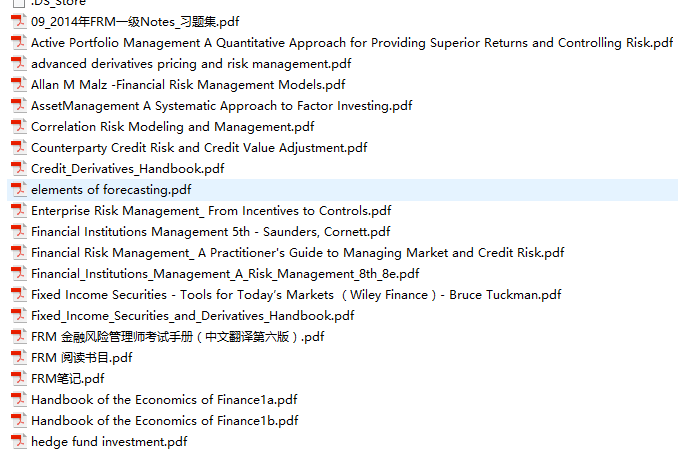 根据官方提供的所有的 阅读资料,逐个对应从图书馆下载下来的,估计有一两个没找到,也不是重点,基本上全部都在里面了,fabozzi的固定收益证券我没下,这书烂大街了都,这书如果没学过那离这行距离还很远