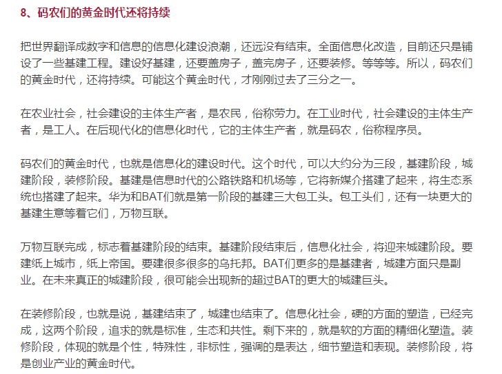 任何行业,都不是永恒兴旺的,所以任何就业都不是终生就业,那么任何失业,也都不是终生失业。这就是行业迁徙与就业迁徙。未来只需要很少的人,就可以满足全国人民需要的农业需求,只需要很少的人,就可以满足全国人民的工业品需求。而剩下来的劳动者呢,都会迁徙到服务业。