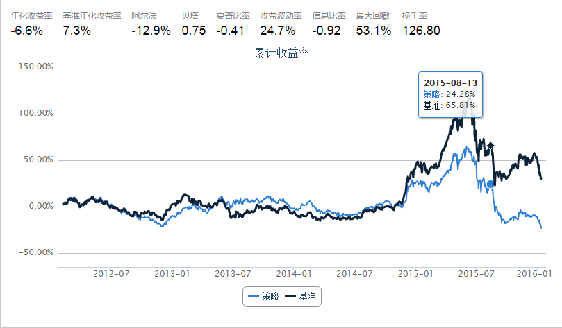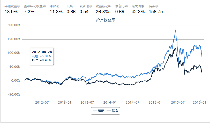 确定因子以后,我就开始对它的有效性进行研究。首先利用收益波动因子挑选出排名前5%和最后5%的股票。等权重买入,持有5天后卖出,看看相对基准的收益。挑选的股票池是HS300,选用的基准也是HS300,数据和回测平台来源于优矿。